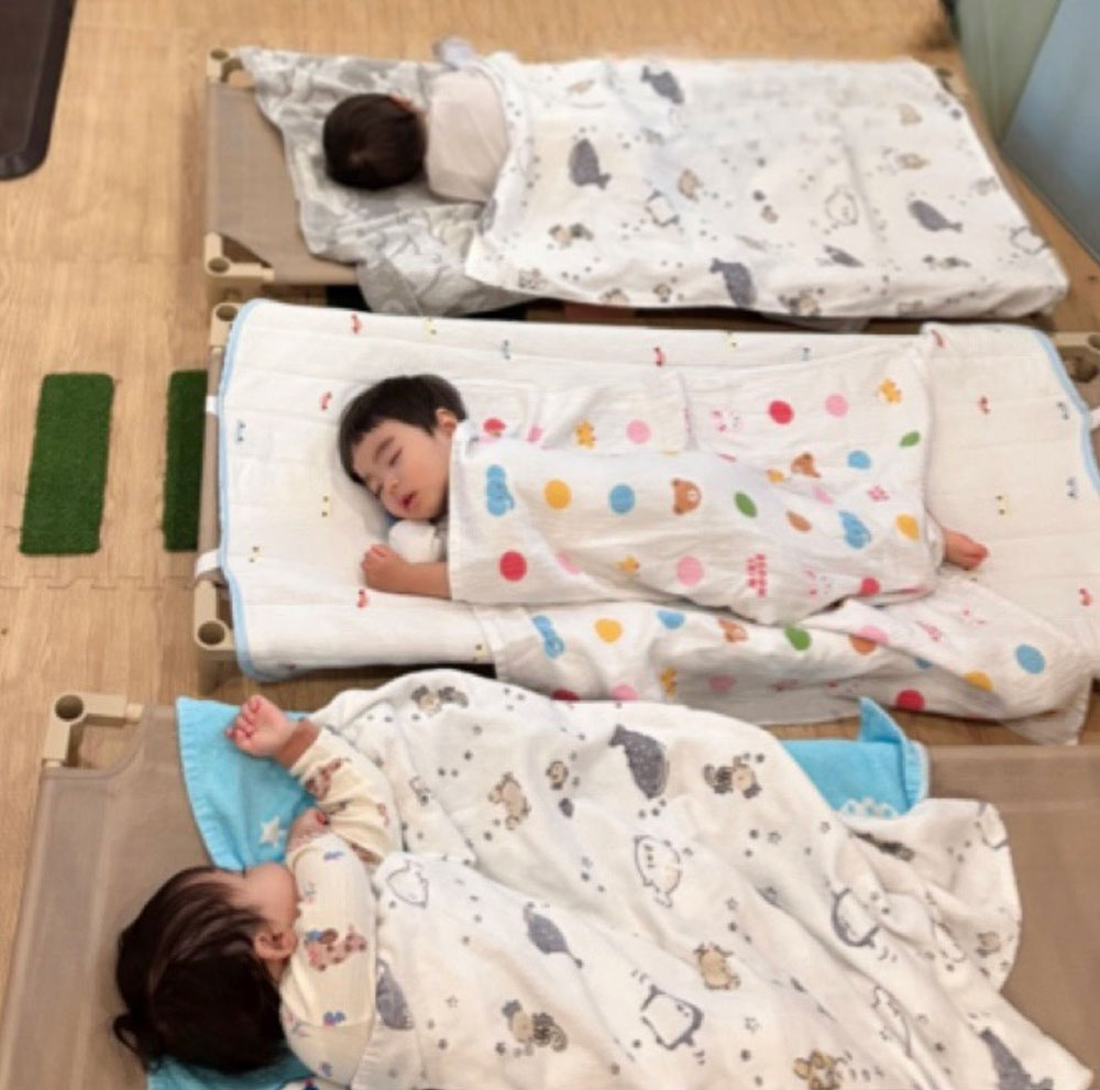 コットというお昼寝用ベッドを使用していますので、コットシーツ・タオルケット各1枚のご用意をお願いします。